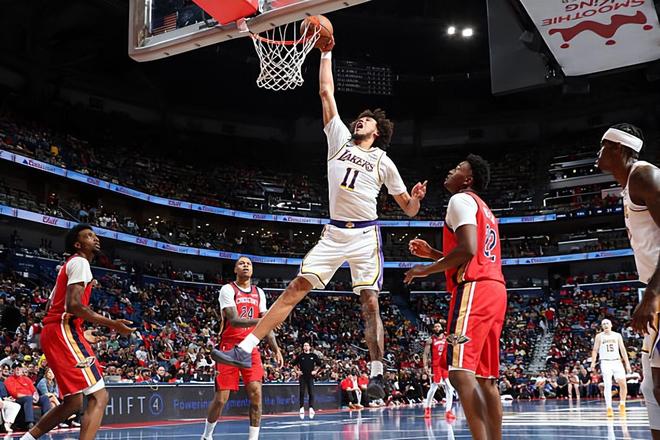 本场比赛中,湖人的替补中锋贾克森-海斯(Jaxson Hayes)也是保持了较高的水准。海斯全场出场16分41秒,投篮4中3,罚球4中4,得到了10分6篮板1助攻2抢断的数据,还有2次失误和1次犯规,正负值为+10。海斯在进攻端也是发挥出了自己的特点,他展现出了不错的篮下终结能力和得分能力,他也是能够在进攻端起到不小的作用的,他的强力扣篮也是能够提升球队的士气。海斯在防守端同样有着不俗的表现,他也是能够起到很好的效果并且在内线防守方面发挥出自己的作用。海斯毕竟只是一名出场时间不多且出手次数有限的替补中锋,能够打出这样的表现已经算是远远超出大家预期了,他也为球队的这场胜利做出了不小的贡献。