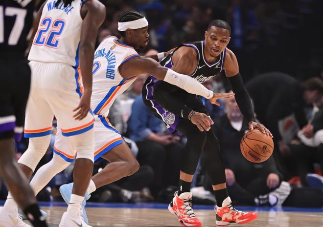 比赛过程:此役国王安排威少先发登场,回到先发威少火力全开,首节三分线外3投3中,国王客场始终压制雷霆,次节国王依旧全民皆兵占据主动,雷霆这边亚历山大无法获得罚球,球队进攻缺少了重要一环!下半场回来,双方的命中率都出现明显下滑,亚历山大再拿6分延续了自己第77场20+的表现,但雷霆始终无法改变被压制的局面,三节结束还剩落后3分,决胜节双方纠缠到最后两分钟,雷霆攻防两端突然发力,小萨、拉文连续篮板球犯错,维金斯、卡鲁索、亚历山大、多尔特持续火力输出,两支球队的实力差距显露无疑,SGA关键不讲理三分投中,比赛失去悬念,残阵雷霆依旧5连胜开局,实力太强了!